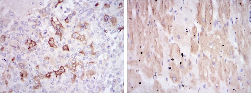 Immunohistochemical analysis of paraffin-embedded human breast cancer tissues (left) and cardiac muscle tissues (right) using HSP27 mouse mAb with DAB staining.