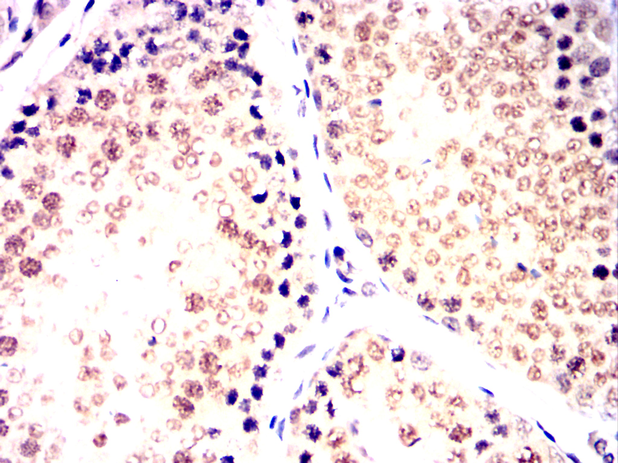 Immunohistochemical analysis of paraffin-embedded Rabbit testis using CDK9 mouse mAb with DAB staining.