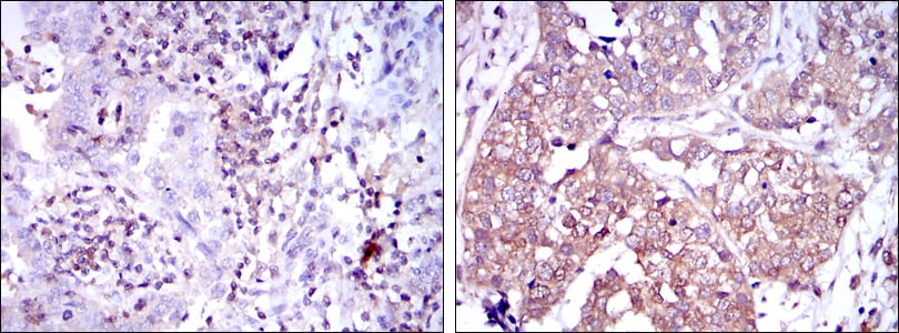 Immunohistochemical analysis of paraffin-embedded human intima cancer tissues (left) and human bladder cancer tissues (right) using NFKB1 mouse mAb with DAB staining.