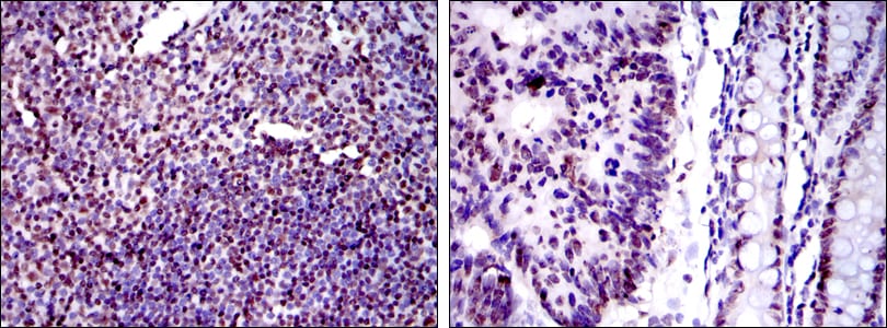 Immunohistochemical analysis of paraffin-embedded human tonsil tissues (left) and human colon cancer tissues (right) using XRCC5 mouse mAb with DAB staining.