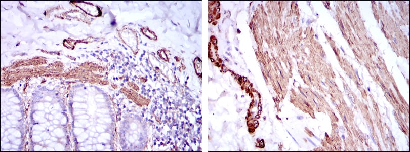 Immunohistochemical analysis of paraffin-embedded human duodenum tissues (left) and human esophagus tissues (right) using ACTA2 mouse mAb with DAB staining.