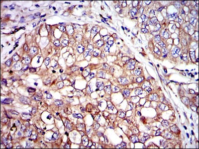 Immunohistochemical analysis of paraffin-embedded human intima cancer tissues using CRK mouse mAb with DAB staining.