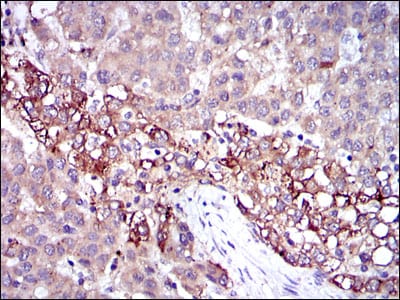 Immunohistochemical analysis of paraffin-embedded human liver cancer tissues using FGG mouse mAb with DAB staining.