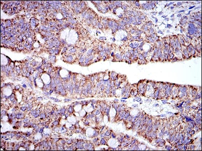 Immunohistochemical analysis of paraffin-embedded human rectum cancer tissues using PHB mouse mAb with DAB staining.