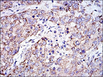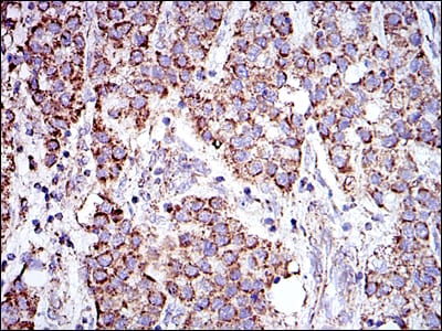 Immunohistochemical analysis of paraffin-embedded human liver cancer tissues using PHB mouse mAb with DAB staining.