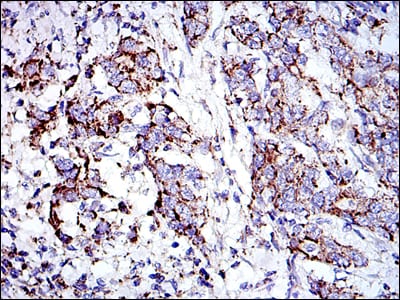 Immunohistochemical analysis of paraffin-embedded human lung cancer tissues using PHB mouse mAb with DAB staining.