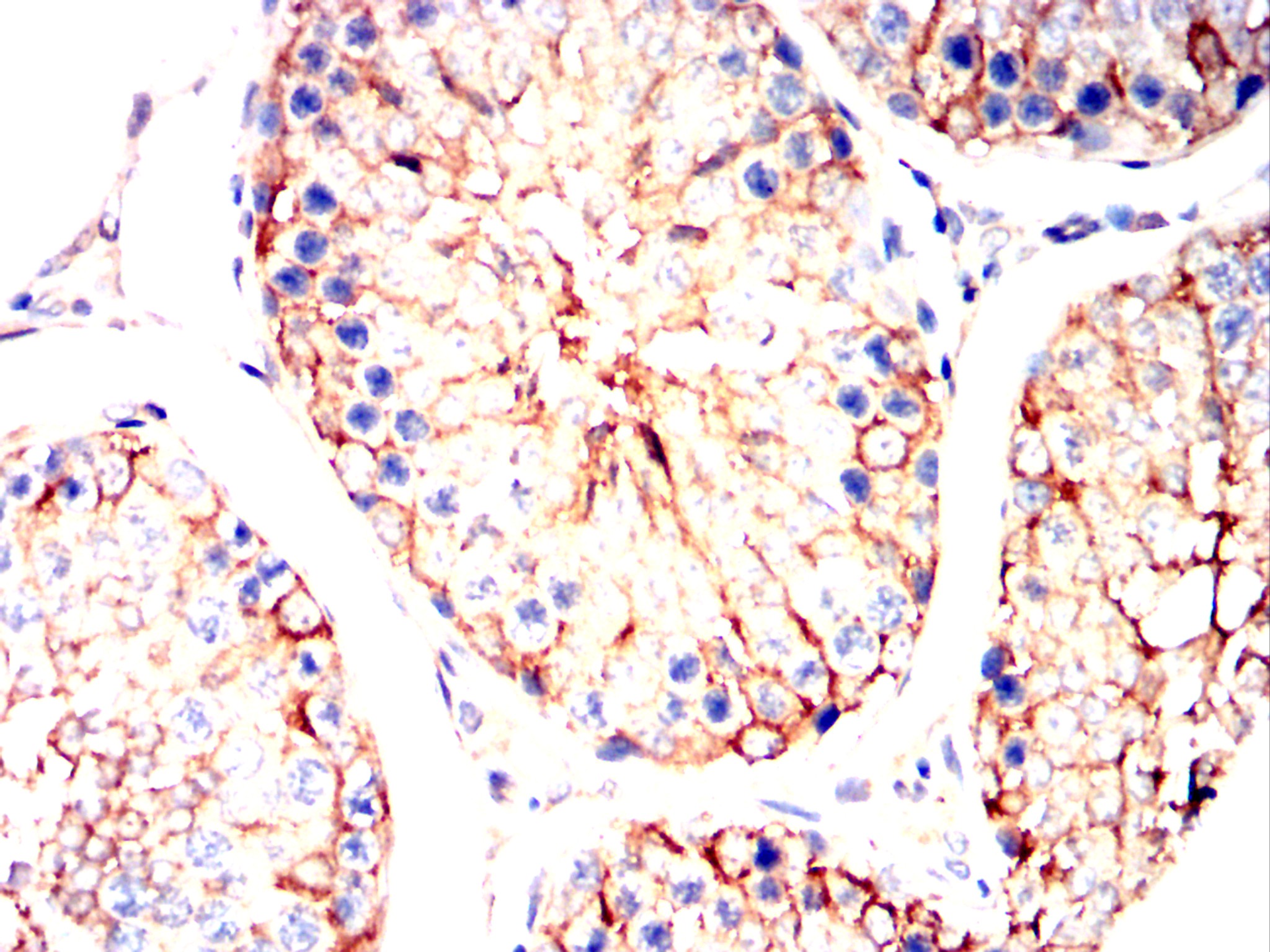 Immunohistochemical analysis of paraffin-embedded Rabbit testicles using G6PD mouse mAb with DAB staining.