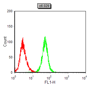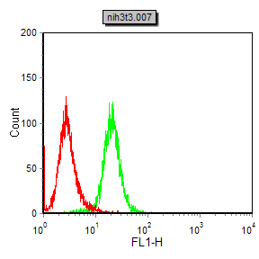 Flow cytometric analysis of NIH3T3 cells using G6PD mouse mAb (green) and negative control (red).