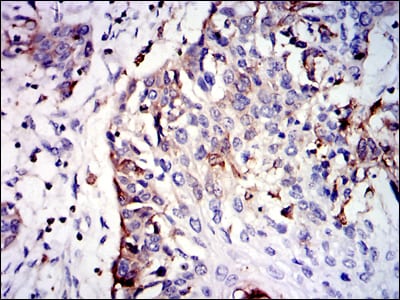 Immunohistochemical analysis of paraffin-embedded human esophageal cancer tissues using GSTM1 mouse mAb with DAB staining.