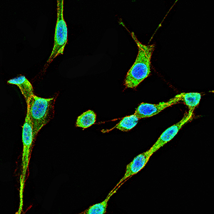 Immunofluorescence analysis of C6 cells using NQO1 mouse mAb (green). Blue: DRAQ5 fluorescent DNA dye. Red: Actin filaments have been labeled with Alexa Fluor- 555 phalloidin.