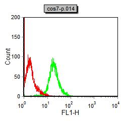 Flow cytometric analysis of COS7 cells using NQO1 mouse mAb (green) and negative control (red).