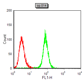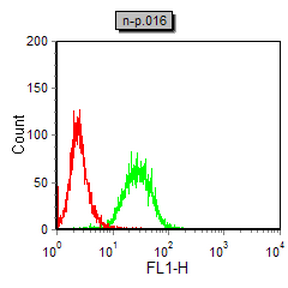 Flow cytometric analysis of NIH/3T3 cells using FOXO1 mouse mAb (green) and negative control (red).