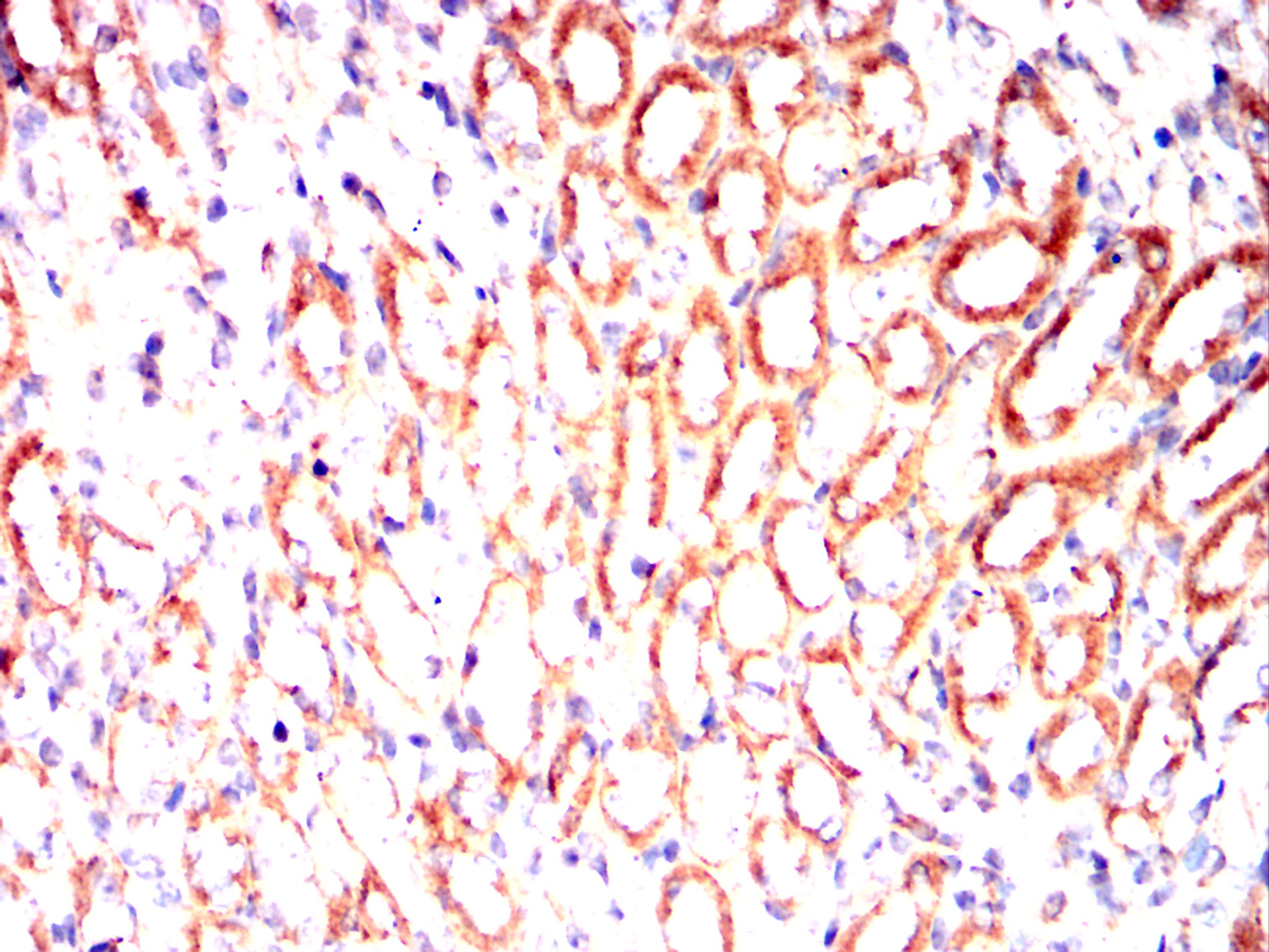 Immunohistochemical analysis of paraffin-embedded Rat kidney using ALPL mouse mAb with DAB staining.