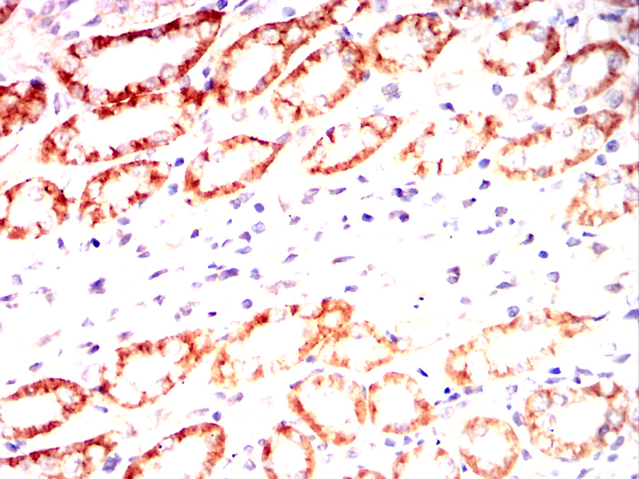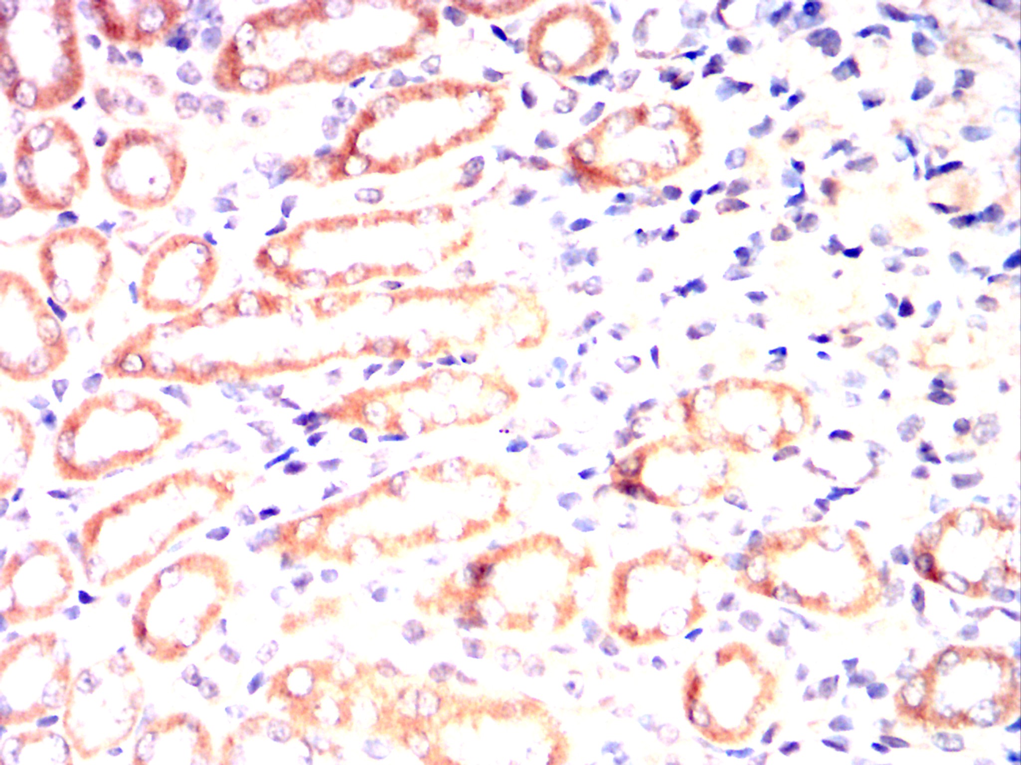 Immunohistochemical analysis of paraffin-embedded Rabbit kidney using ALPL mouse mAb with DAB staining.