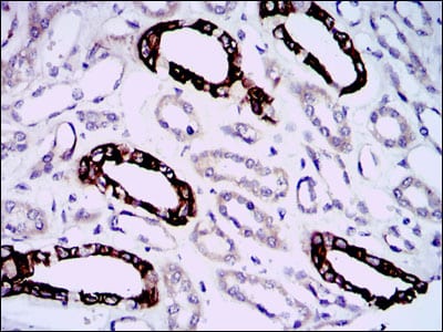 Immunohistochemical analysis of paraffin-embedded human kidney tissues using GAB1 mouse mAb with DAB staining.