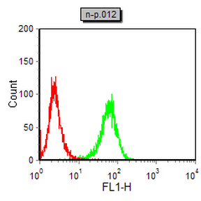 Flow cytometric analysis of NIH/3T3 cells using NOS2 mouse mAb (green) and negative control (red).