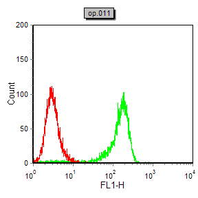 Flow cytometric analysis of Hela cells using NOS2 mouse mAb (green) and negative control (red).