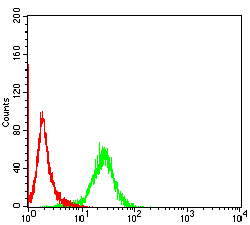Flow cytometric analysis of NIH/3T3 cells using MAP1LC3B mouse mAb (green) and negative control (red).
