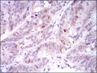 Immunohistochemical analysis of paraffin-embedded human rectum cancer tissues using PLK1 mouse mAb with DAB staining.