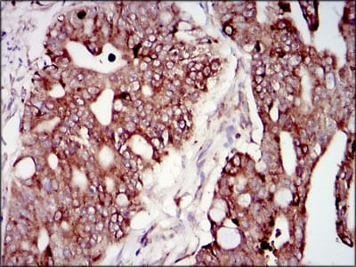 Immunohistochemical analysis of paraffin-embedded human cervical cancer tissues using PIK3R1 mouse mAb with DAB staining.