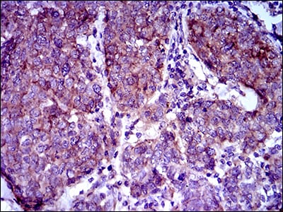 Immunohistochemical analysis of paraffin-embedded human breast cancer tissues using ABCB5 mouse mAb with DAB staining.