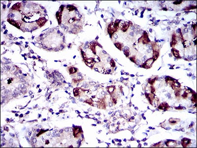 Immunohistochemical analysis of paraffin-embedded human stomach tissues using SLC27A5 mouse mAb with DAB staining.
