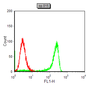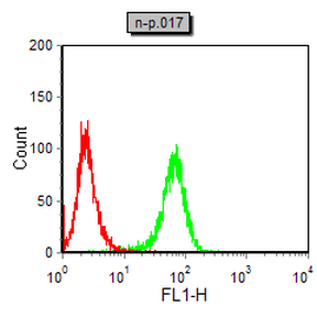 Flow cytometric analysis of NIH/3T3 cells using MEF2C mouse mAb (green) and negative control (red).