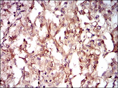 Immunohistochemical analysis of paraffin-embedded human renal cancer tissues using GUCY1A3 mouse mAb with DAB staining.