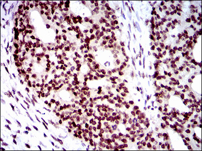 Immunohistochemical analysis of paraffn-embedded ovarian cancer tissues using WHSC2 mouse mAb with DAB staining