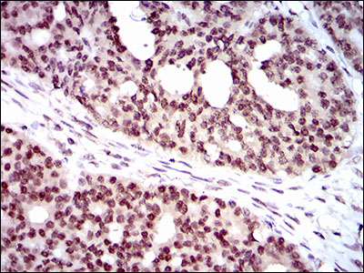 Immunohistochemical analsis of oaraffn-embedded ovariar cancer tissues using WHSC2 mouse mAb with DAB staining.