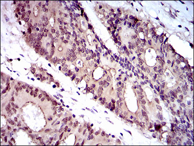 Immunohistochemical analysis of oaraffn-embedded colon cancer tissues using WHSC2 mouse mAb with DAB staining.