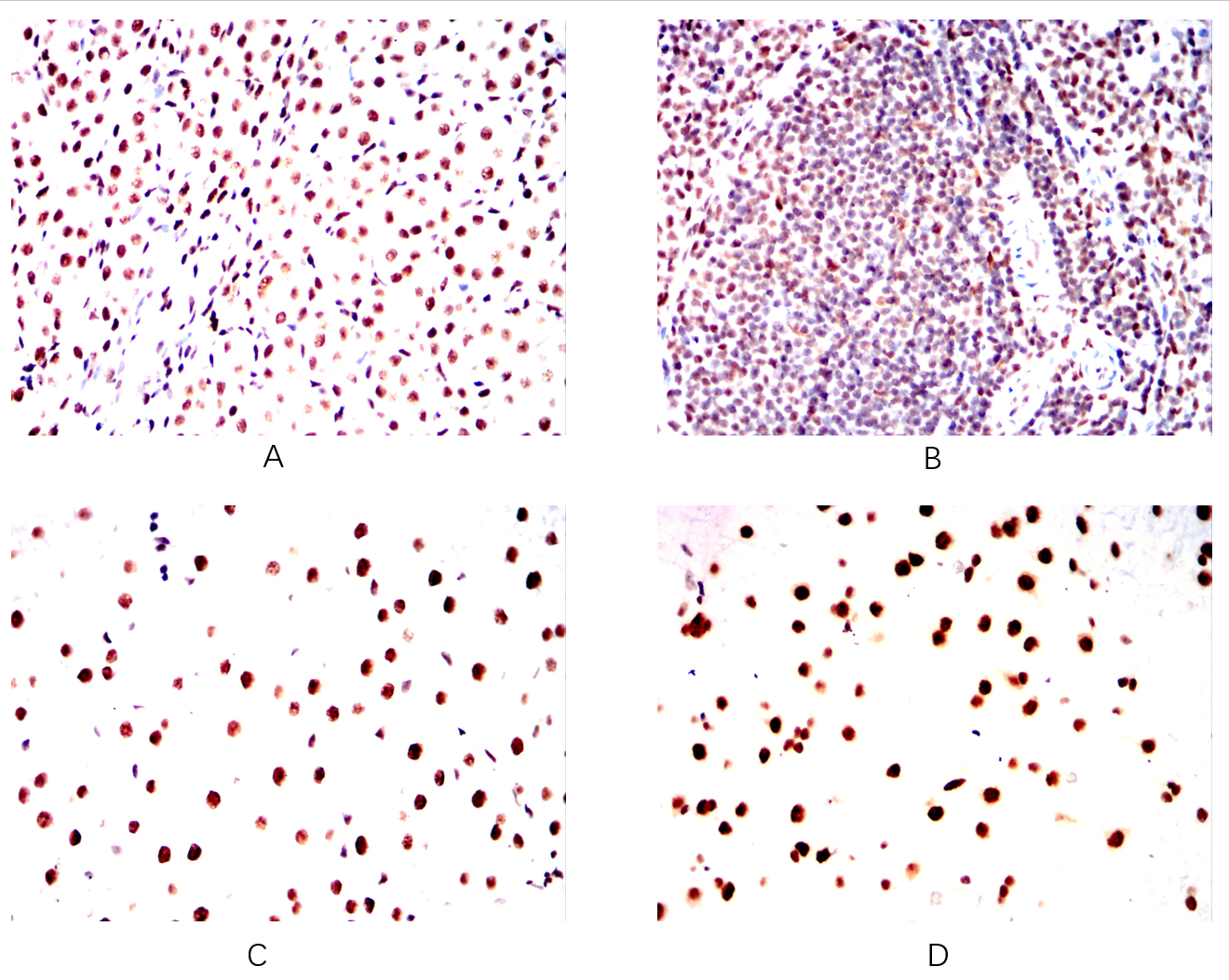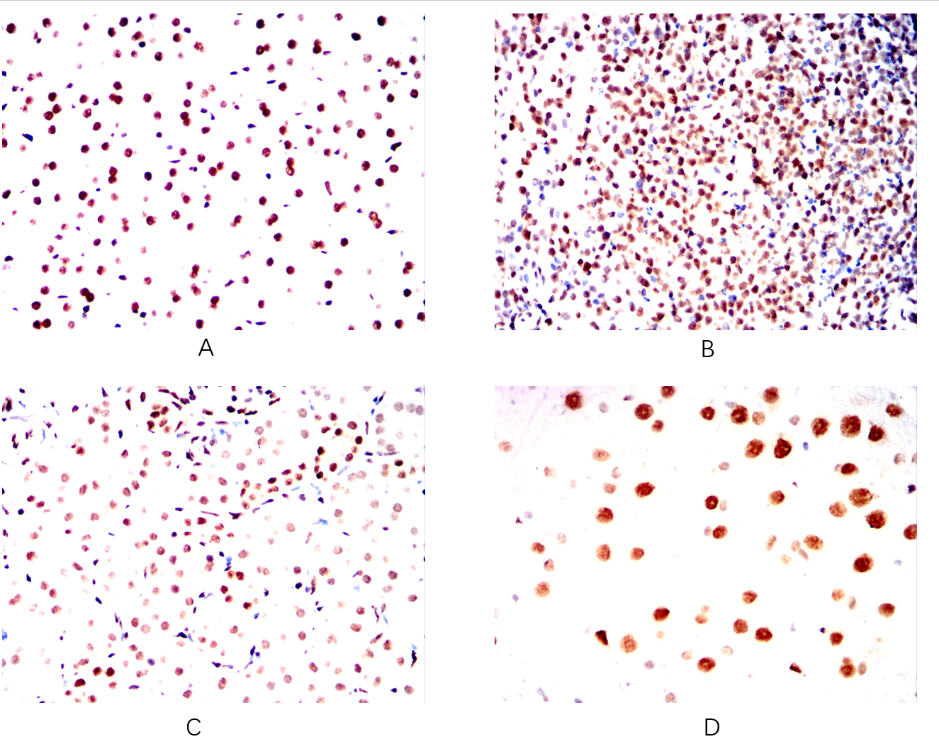 Immunohistochemical analysis of paraffin-embedded Rabbit kidney(A)Rabbit spleen(B)Rabbit liver(C)Rabbit brain(D) using TWIST1 mouse mAb with DAB staining.