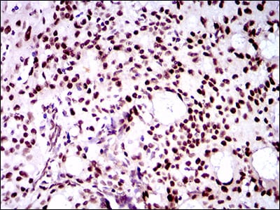 Immunohistochemical analysis of paraffin-embedded human cervical cancer tissues using TWIST1 mouse mAb with DAB staining.