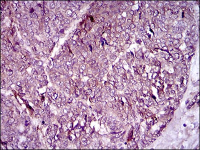 Immunohistochemical analysis of paraffin-embedded human esophageal cancer tissues using MCAM mouse mAb with DAB staining.