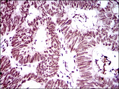 Immunohistochemical analysis of paraffin-embedded human rectum cancer tissues using Ring1 mouse mAb with DAB staining.