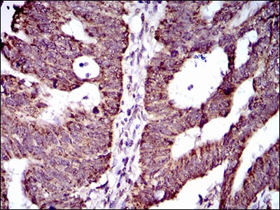 Immunohistochemical analysis of paraffin-embedded human rectum cancer tissues using ABCG5 mouse mAb with DAB staining.