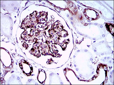Immunohistochemical analysis of paraffin-embedded human kidney tissues using SYCP3 mouse mAb with DAB staining.