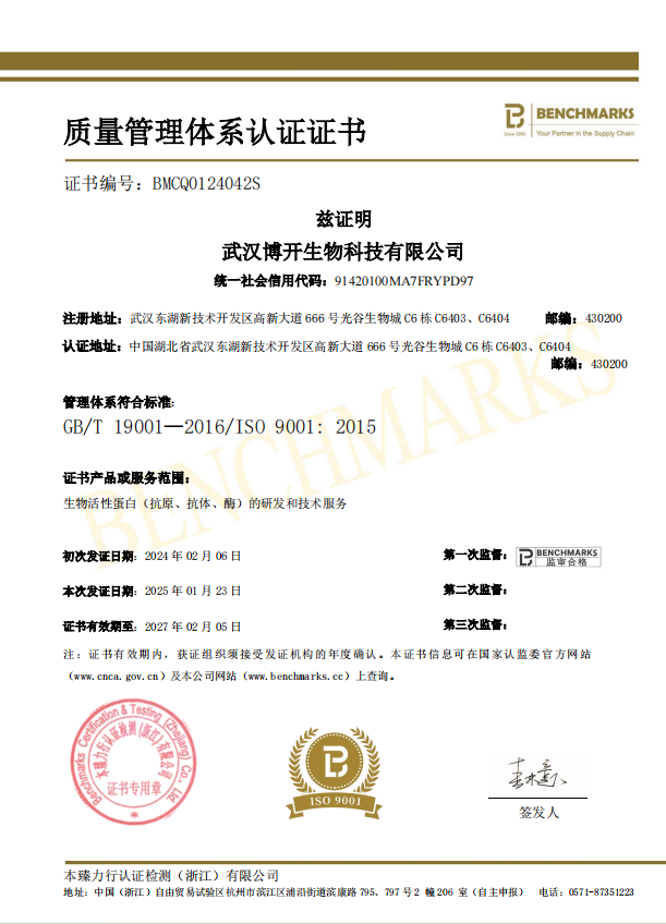 博开生物通过ISO9001认证,强化产品质量管理2025-05-07武汉博开生物科技有限公司(以下简称“博开生物”),一家专注于活性重组蛋白研发和生产的高新技术企业,近日宣布成功通过ISO9001国际质量管理体系认证。这一成就标志着博开生物在质量管理和产品质量方面达到了国际标准,进一步巩固了其在生物技术领域的领先地位。 博开生物自成立以来,一直将产品质量视为企业的生命线。为了不断提升产品质量,公司不仅... -