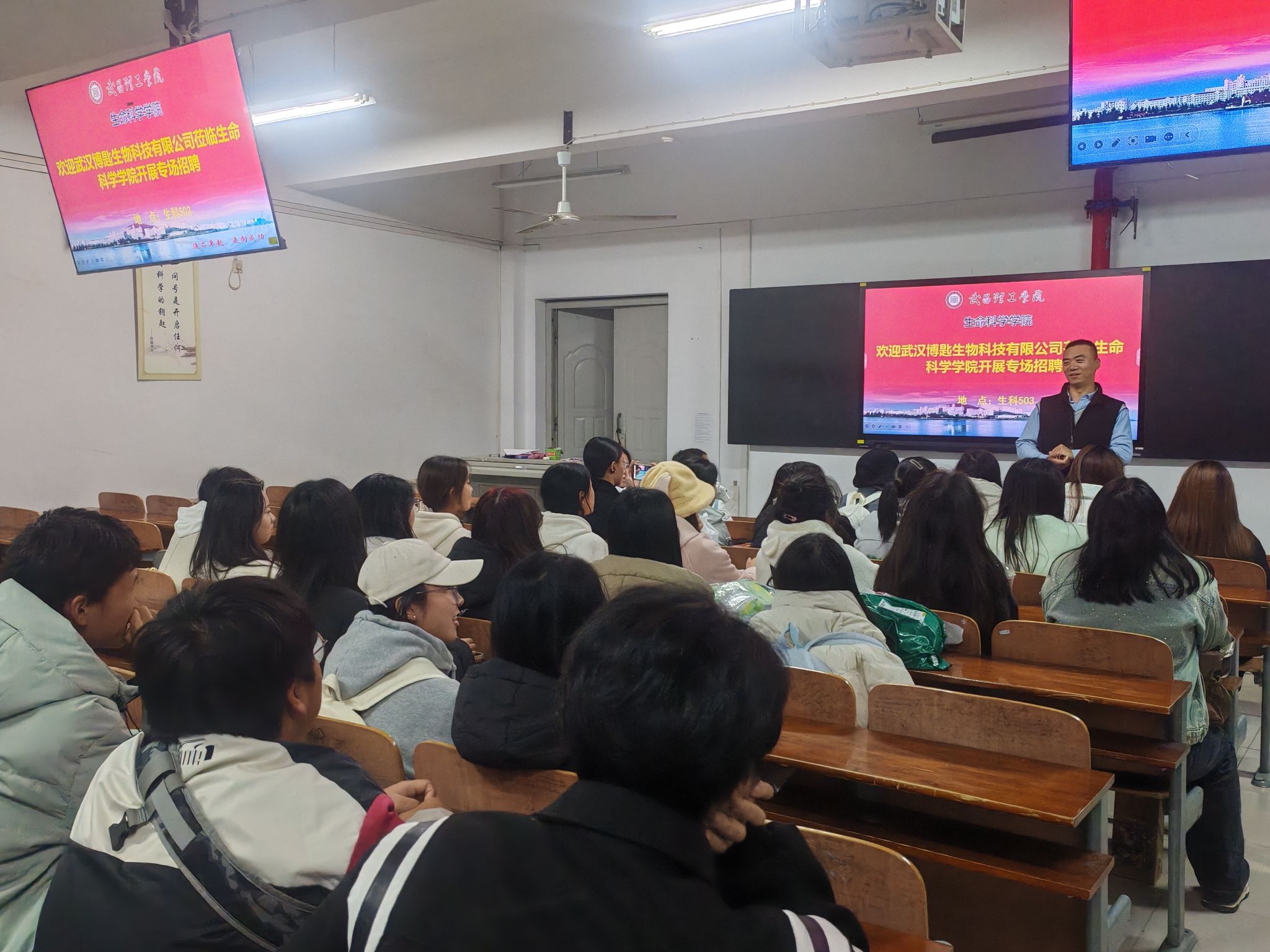 武昌理工学院生命科学学院与武汉博开生物科技有限公司联合开展专场招聘会2024-12-28中南在线11月21日消息(通讯员方艳丽报道)为贯彻武昌理工学院校企合作政策、促使生命科学学院学子高质量就业,武汉博开生物科技有限公司于11月20日下午在生命科学学院503教室开展专场招聘会。博开生物科技有限公司总经理刘光桥博士为招聘会主讲人,生命科学学院党总支书记胡瑞年及生命科学学院学子共同参与本次专场招聘会。在本次招聘会中,武汉博开生物科技有限公司总经理刘光桥博士热情地向...