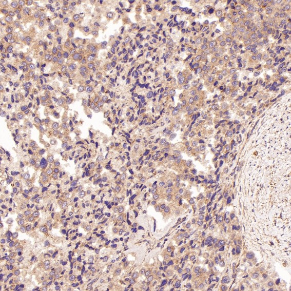 Immunohistochemical analysis of paraffin-embedded Human esophageal carcinoma, using the Antibody at 1:100 dilution.