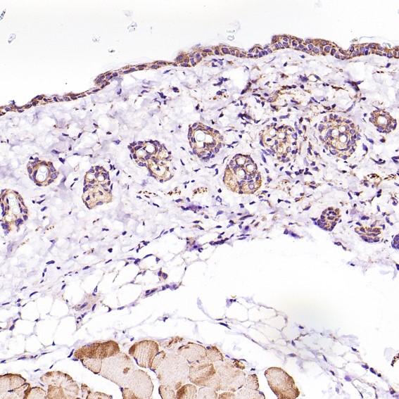 Immunohistochemical analysis of paraffin-embedded Mouse skin, using the Antibody at 1:200 dilution.