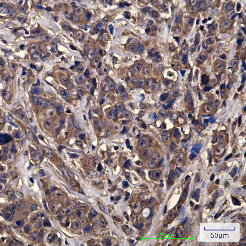 Immunohistochemistry analysis of paraffin-embedded Human breast cancer tissue using eIF4A1 antibody.High-pressure and temperature Sodium Citrate pH 6.0 was used for antigen retrieval.