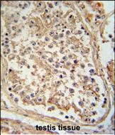 GTPBP2 antibody (C-term) (Cat. #P30744) immunohistochemistry analysis in formalin fixed and paraffin embedded human testis tissue followed by peroxidase conjugation of the secondary antibody and DAB staining. This data demonstrates the use of the GTPBP2 antibody (C-term) for immunohistochemistry. Clinical relevance has not been evaluated.