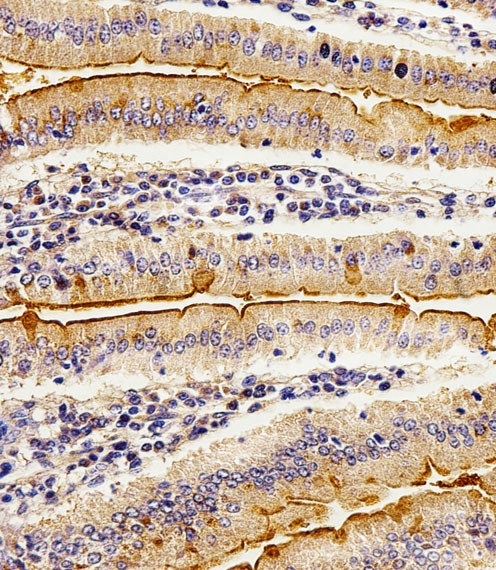 Immunohistochemical analysis of paraffin-embedded M.small intestine section using JAK2 Antibody(C-term)(Cat#P32789). P32789 was diluted at 1:100 dilution. A peroxidase-conjugated goat anti-rabbit IgG at 1:400 dilution was used as the secondary antibody, followed by DAB staining.