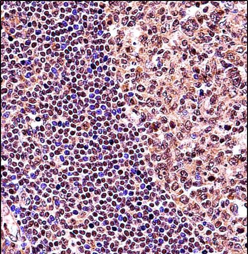 TCF3 Antibody (C-term) (Cat. #P33614)immunohistochemistry analysis in formalin fixed and paraffin embedded human tonsil tissue followed by peroxidase conjugation of the secondary antibody and DAB staining.This data demonstrates the use of TCF3 Antibody (C-term) for immunohistochemistry. Clinical relevance has not been evaluated.
