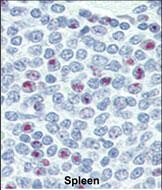 Formalin-fixed and paraffin-embedded human Spleen tissue reacted with NANOG Antibody (N-term)(Cat.#P33758), which was peroxidase-conjugated to the secondary antibody, followed by AEC staining. This data demonstrates the use of this antibody for immunohistochemistry; clinical relevance has not been evaluated.