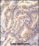 Formalin-fixed and paraffin-embedded human lung carcinoma tissue reacted with Autophagy APG12L antibody (N-term) (Cat.#P33999), which was peroxidase-conjugated to the secondary antibody, followed by DAB staining. This data demonstrates the use of this antibody for immunohistochemistry; clinical relevance has not been evaluated.