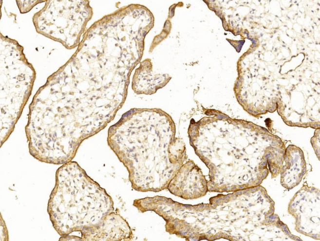 Immunohistochemical analysis of paraffin-embedded human placent tissue using P34463 performed on the Leica® BOND RXm. Tissue was fixed with formaldehyde at room temperature; antigen retrieval was by heat mediation with a EDTA buffer (pH9. 0). Samples were incubated with primary antibody(1:1000) for 1 hours at room temperature. A undiluted biotinylated CRF Anti-Polyvalent HRP Polymer antibody was used as the secondary antibody.