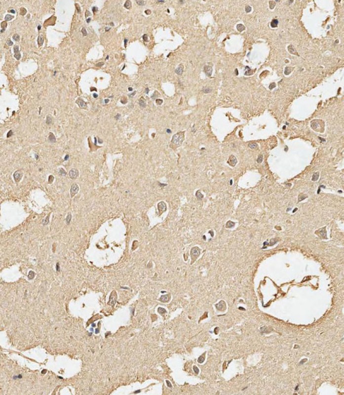 P34460 staining hCalmodulin-D132 in human brain tissue sections by Immunohistochemistry (IHC-P - paraformaldehyde-fixed, paraffin-embedded sections). Samples were incubated with primary antibody (1/250) for 1 hours at room temperature. A undiluted biotinylated goat polyvalent antibody was used as the secondary antibody.