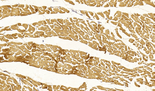 Immunohistochemical analysis of paraffin-embedded human heart tissue using P34486 performed on the Leica® BOND RXm. Tissue was fixed with formaldehyde at room temperature; antigen retrieval was by heat mediation with a EDTA buffer (pH9. 0). Samples were incubated with primary antibody(1:1000) for 1 hours at room temperature. A undiluted biotinylated CRF Anti-Polyvalent HRP Polymer antibody was used as the secondary antibody.